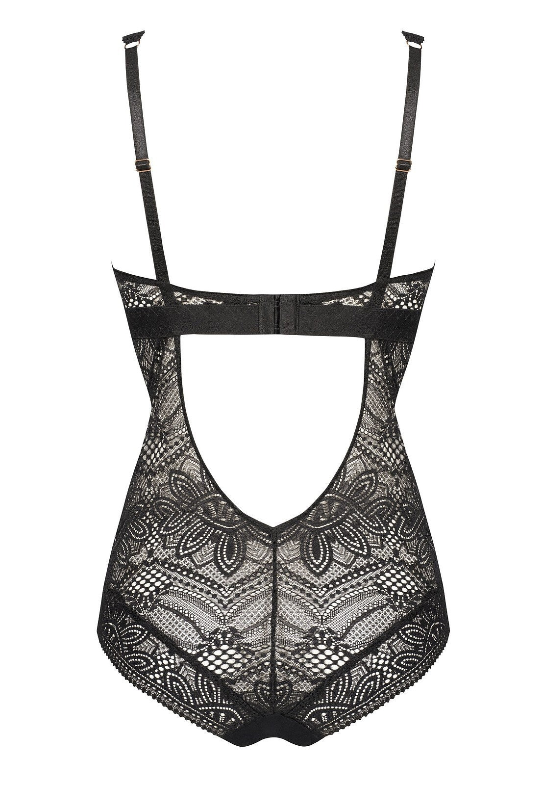 Body con coppe preformate senza ferretti, la coppetta interna e in contrasto con il pizzo nero. La parte superiore si aggancia sul retro come un classico reggiseno.