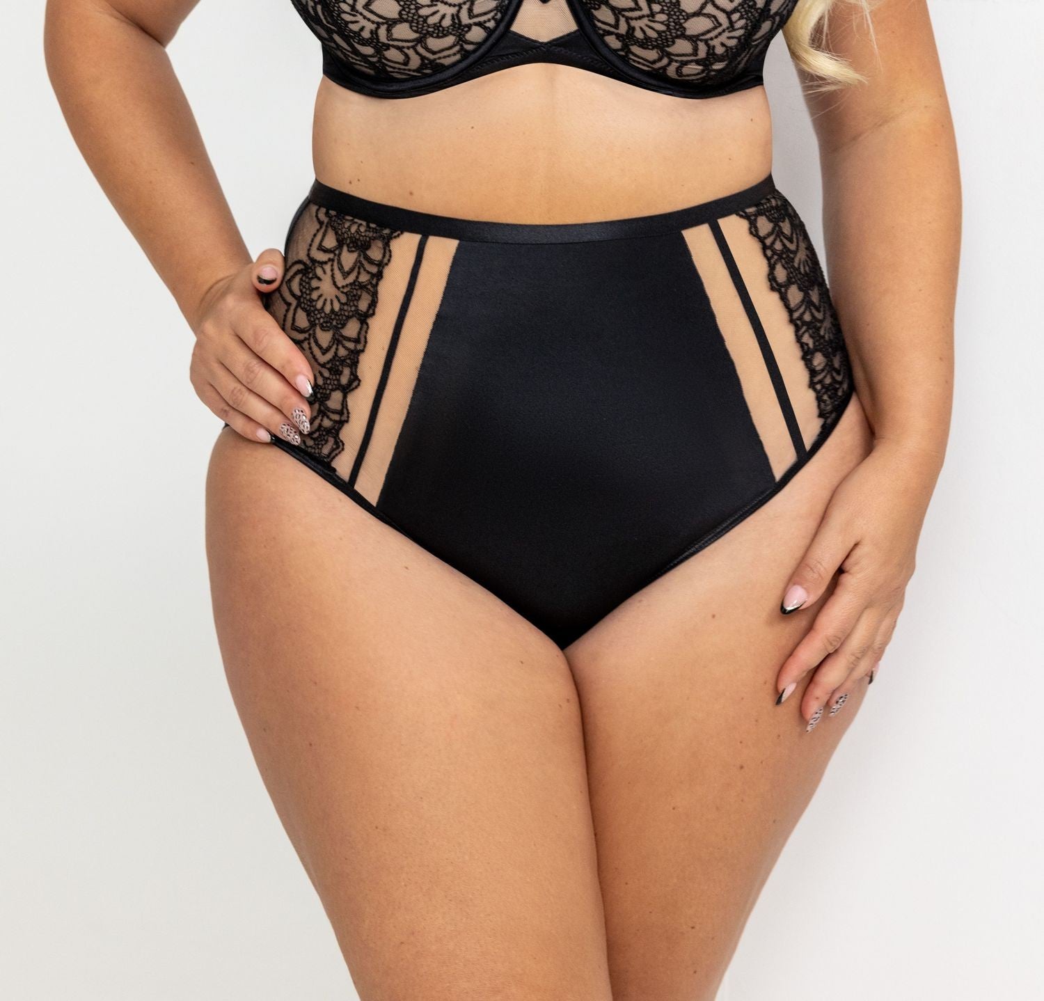Mutanda donna plus size a vita altissima leggermente contenitiva, perfetta per chi vuole modellare leggermente. Presenta lateralmente inserti in tulle e pizzo. Si adatta perfettamente al corpo senza segnare.